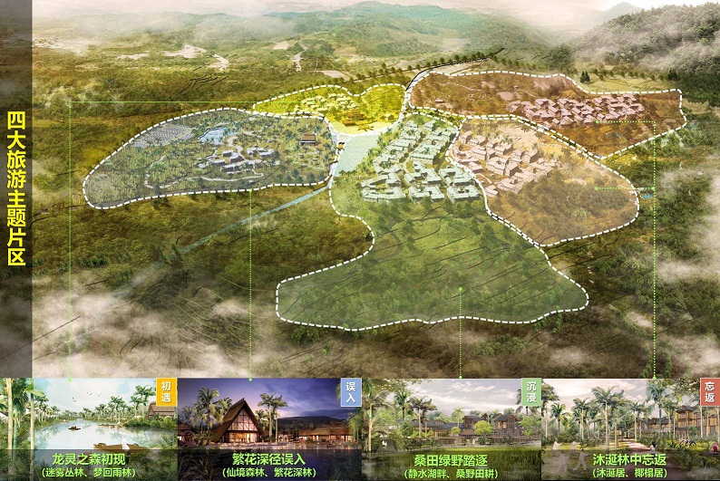 四大旅游主題片區分別為“龍靈之森初現”、“繁花深徑誤入”、“桑田綠野踏逐”、“沐涎林中忘返”,包含“迷霧叢林”、“夢回雨林”、“童話森林”、“繁花之徑”、“桑野田耕”、“龍涎之林”、“椰泉之林”、“有氧深林”八大體驗區。